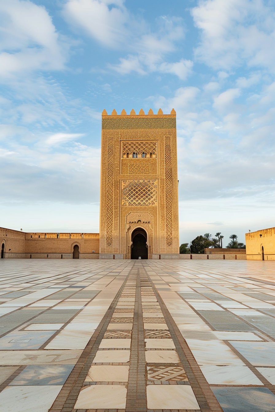 Begin in Casablanca where the Hassan II Mosque stands at the edge of the Atlantic, half on land, half over water. One of the largest mosques on earth but not heavy—buoyant, almost. You arrive in morning when light climbs the minaret and turns glass into grid, marble into breath. The ocean pulls at the foundation. The building does not move.