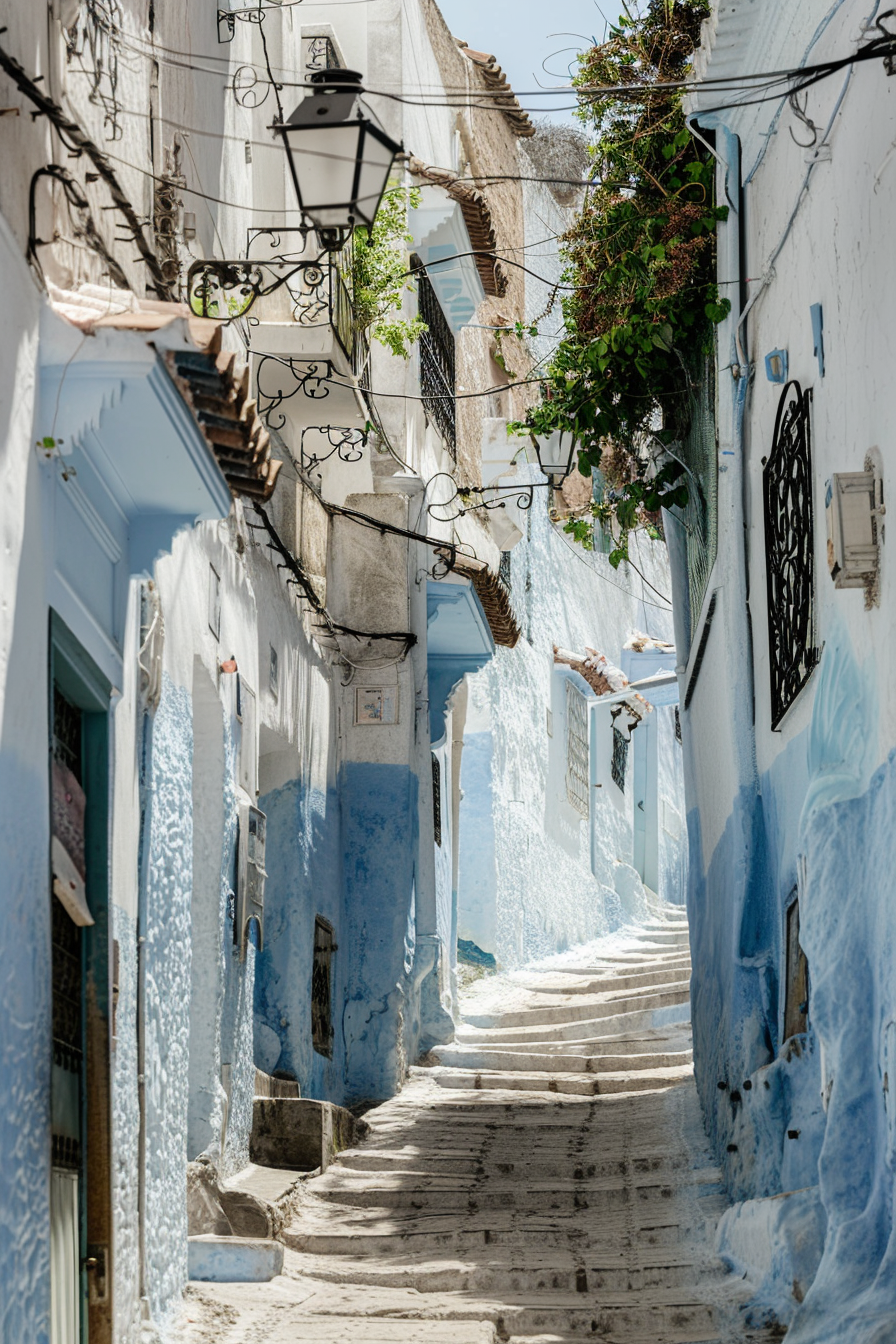 The road turns inland toward the Rif Mountains. Arrive in Chefchaouen, a town painted in quiet shades of sky. Wander its blue lanes, hear the echo of footsteps on stone, and watch sunlight slide across the walls. Time slows; even the air feels soft here.