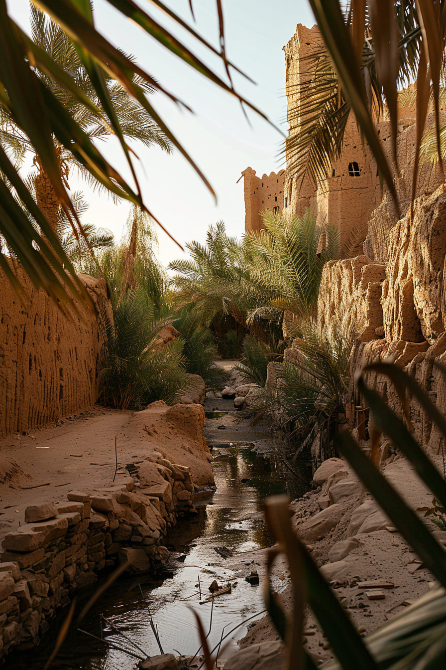 Return toward the Drâa and settle inside Tamnougalt. Walk terraces above the gardens; corridors breathe cool air. Night within earthen walls, candlelight and wind.