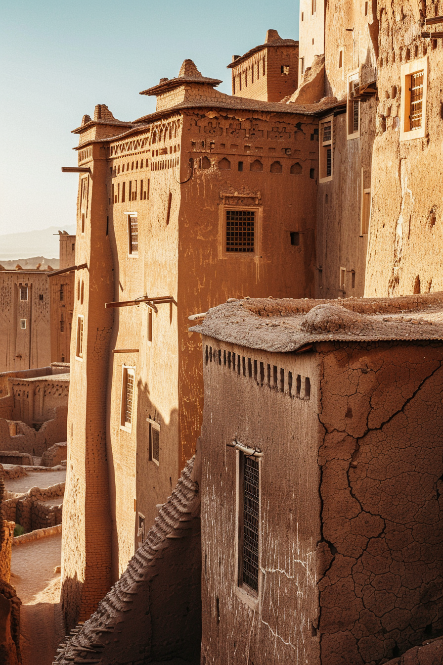 Follow the valley north, past broken forts and dry riverbeds. Arrive in Ouarzazate, where the desert meets the idea of the city. Evening light lies flat and long over rooftops.