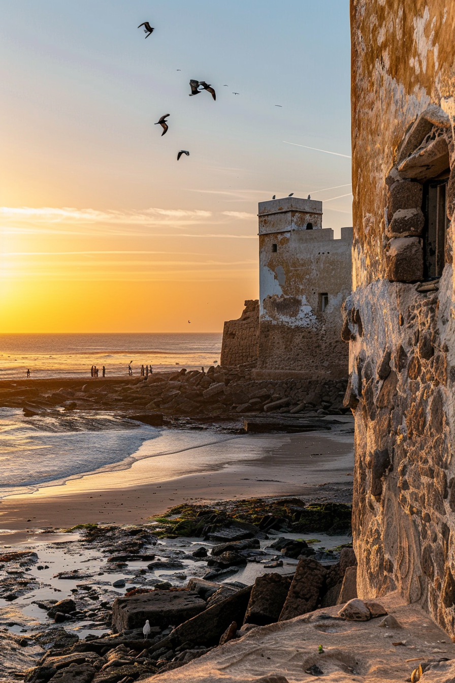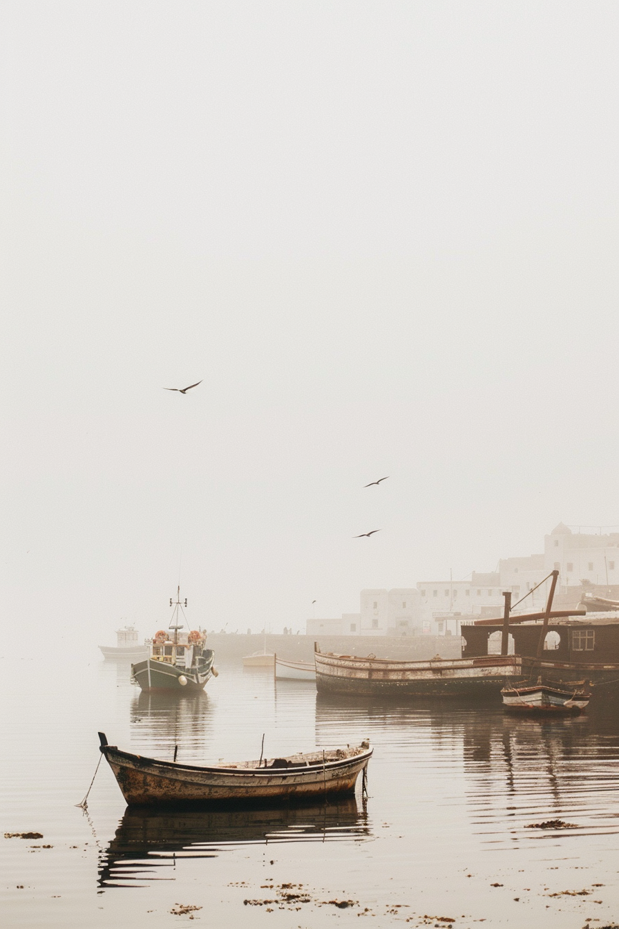 West to the Atlantic. Essaouira rises white against blue, a city built for artists who need wind to think clearly. You visit galleries tucked into whitewashed riads—local painters, sculptors who work with driftwood and memory. Lunch on the ramparts. Wind moves everything. Gulls finish every composition. You understand why so many came here to paint and stayed to unlearn.
