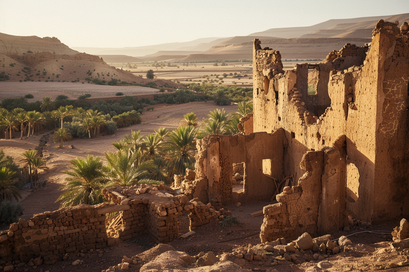 Drive west through barren plateaus. The land feels stripped and ancient. Each ruin could be a kasbah or a granary — or a memory mistaken for one.