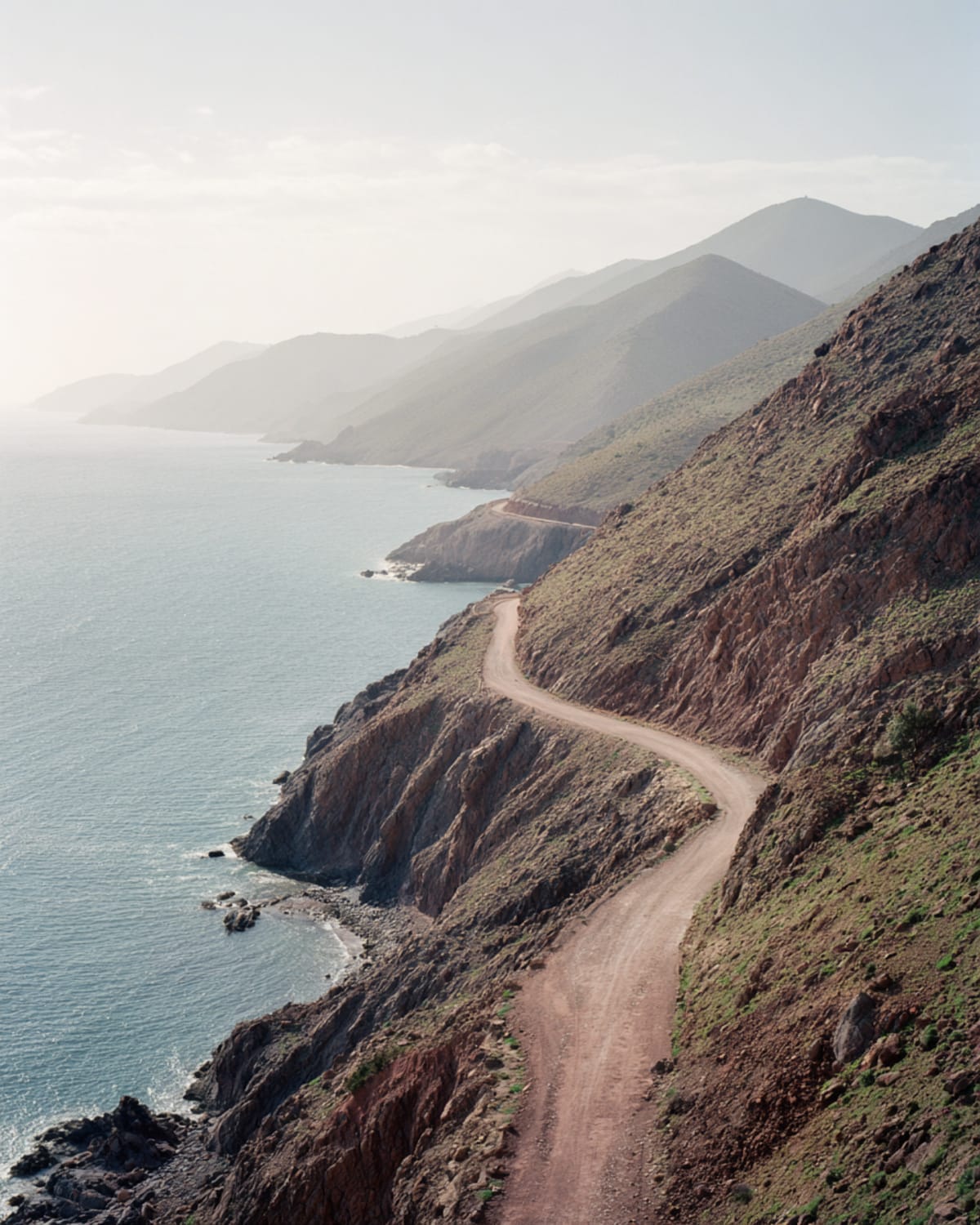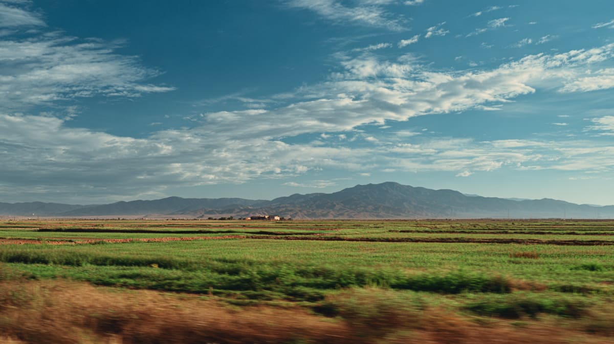 North along the coast. Legzira's red arches disappear behind the cliff and the road climbs through Mirleft — a village perched between red rock and blue water, surfers carrying boards up the path. Tiznit's walls flash past. The Anti-Atlas foothills soften into the Souss plain. Agadir appears sprawled along the bay, modern and low, rebuilt after the earthquake that flattened it in 1960. The beach stretches ten kilometres. The sunset turns the entire bay copper.