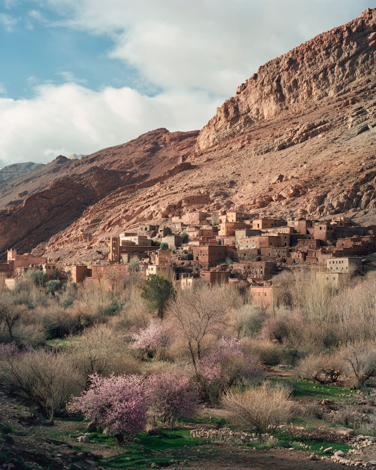 West from the dunes. The sand releases you slowly — first hammada, then the first scrub, then signs for towns that feel like rumours. Erfoud passes with its fossil workshops, trilobites older than imagination. Tinghir appears in its palm grove, the green so vivid after the desert it looks artificial. Then Todra — walls rising vertical and close, the river cold at the bottom, your voice echoing off limestone that has been standing since before the word for stone existed. The road opens into the Dades. The valley glows copper at sunset, the kasbahs catching the last light like lanterns. You sleep in the gorge. The stars are framed by the canyon walls.