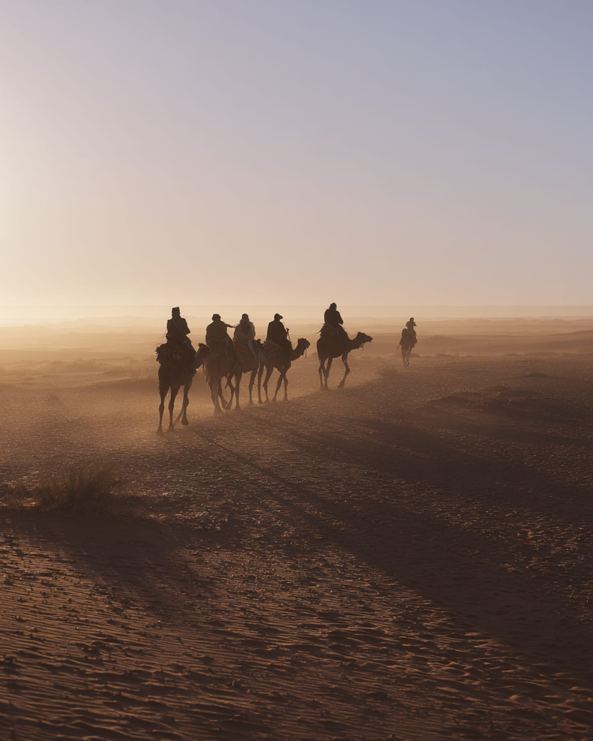 The longest day and the most dramatic shift. South from Fes through the Middle Atlas — cedar forests, Barbary macaques, air so cold and clean it stings your throat. Past Midelt the colour changes. Green to brown to ochre to gold. The Ziz Gorge cuts through red rock, palms lining the river like a procession. Erfoud passes — fossil town, the trilobites older than thought. Then the hammada flattens and empties. And there, rising from nothing, Erg Chebbi. Three hundred metres of sand, glowing copper in the last light. Your camp sits at the base. A camel waits. The sky is already filling with stars.