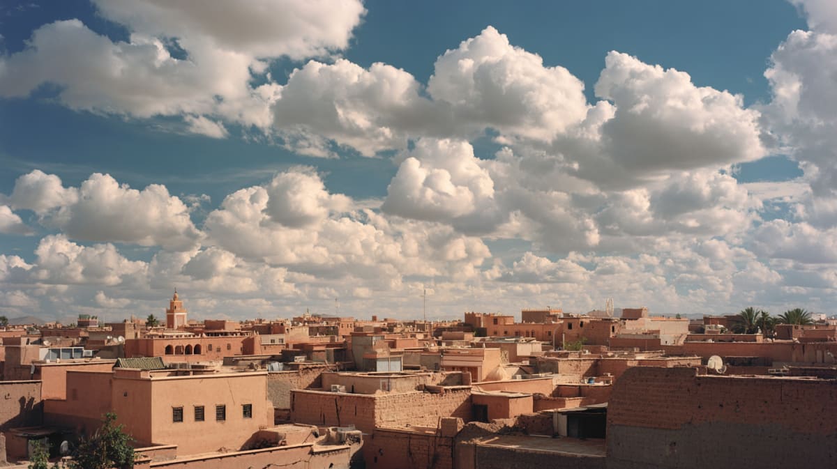 The valley narrows, then releases. Ouarzazate passes at the crossroads — gateway town, the Atlas ahead of you now. Then the climb. Tizi n'Tichka winds upward through stone and shepherd country, the air thinning, the road carved into the mountainside by the French in 1936. You pass through villages where women sell fossils and amethyst from blankets spread on the verge. The pass crests at 2,260 metres. The north side is different — greener, cooler, the smell of thyme and wet stone. By evening Marrakech appears on the plain below, lit amber in the haze. The descent feels like arriving somewhere your body already knows.