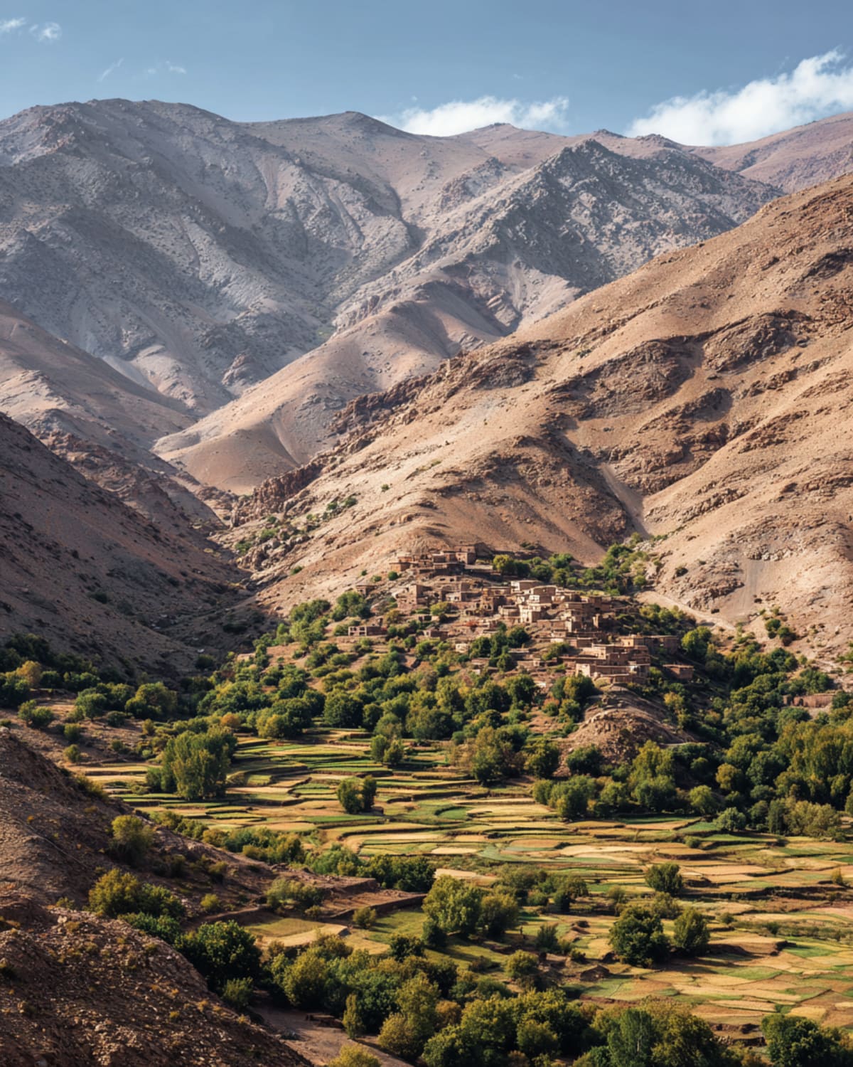 East from Marrakech the Atlas rises like a dare. Past Demnate the road tightens — Imi n'Ifri's natural bridge, a cave where the river carved an arch through the mountain. Then the climb begins properly. Azilal marks the turn into serious mountain country. The switchbacks multiply. Villages cling to ridges with a stubbornness that makes you reconsider everything you know about gravity. Aït Bouguemez opens below — wide, green, terraced, the M'Goun massif presiding with its snow. The Happy Valley. The air tastes of walnut and woodsmoke and altitude.
