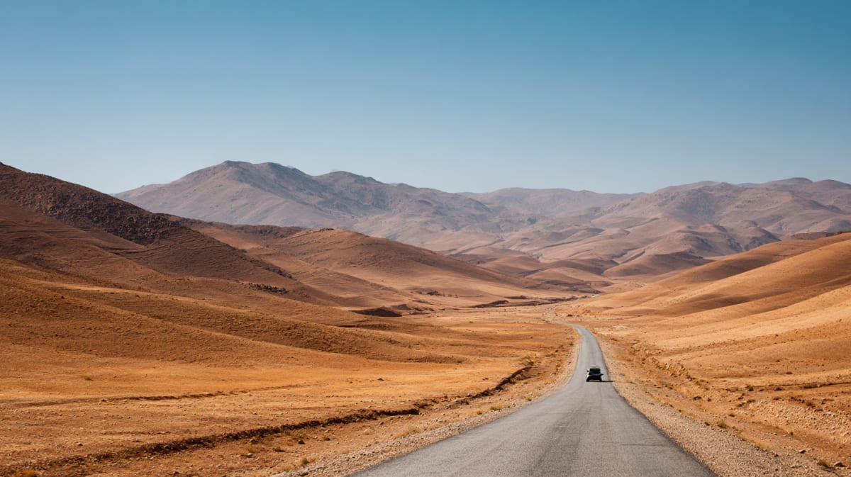 The Draa Valley ends at Zagora, where a sign once promised Timbuktu in 52 days. You go west instead — through Foum Zguid where the café serves coffee thick enough to stand a spoon in and the owner has been standing one in it since the café opened. Tata, where the Anti-Atlas begins its rise from the desert floor in pink granite that has been rising for 600 million years and is in no hurry. Tafraoute's painted boulders pass like a dream. The landscape shifts from sand to rock to green valley, the temperature dropping, the vegetation thickening. You emerge at Tiznit where Berber silversmiths hammer jewellery in workshops that ring like bells. Seven days crossing from desert oasis to Atlantic shore on a route the guidebooks forgot to write about, which is precisely why you should take it.