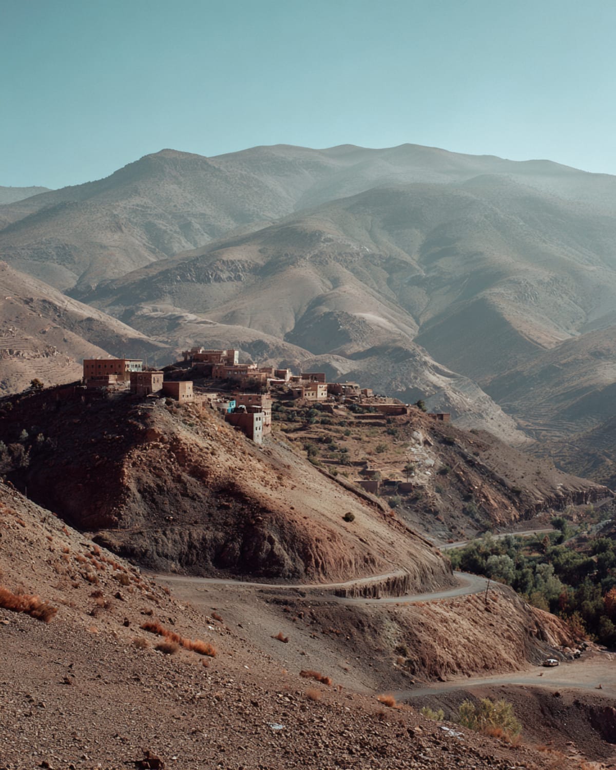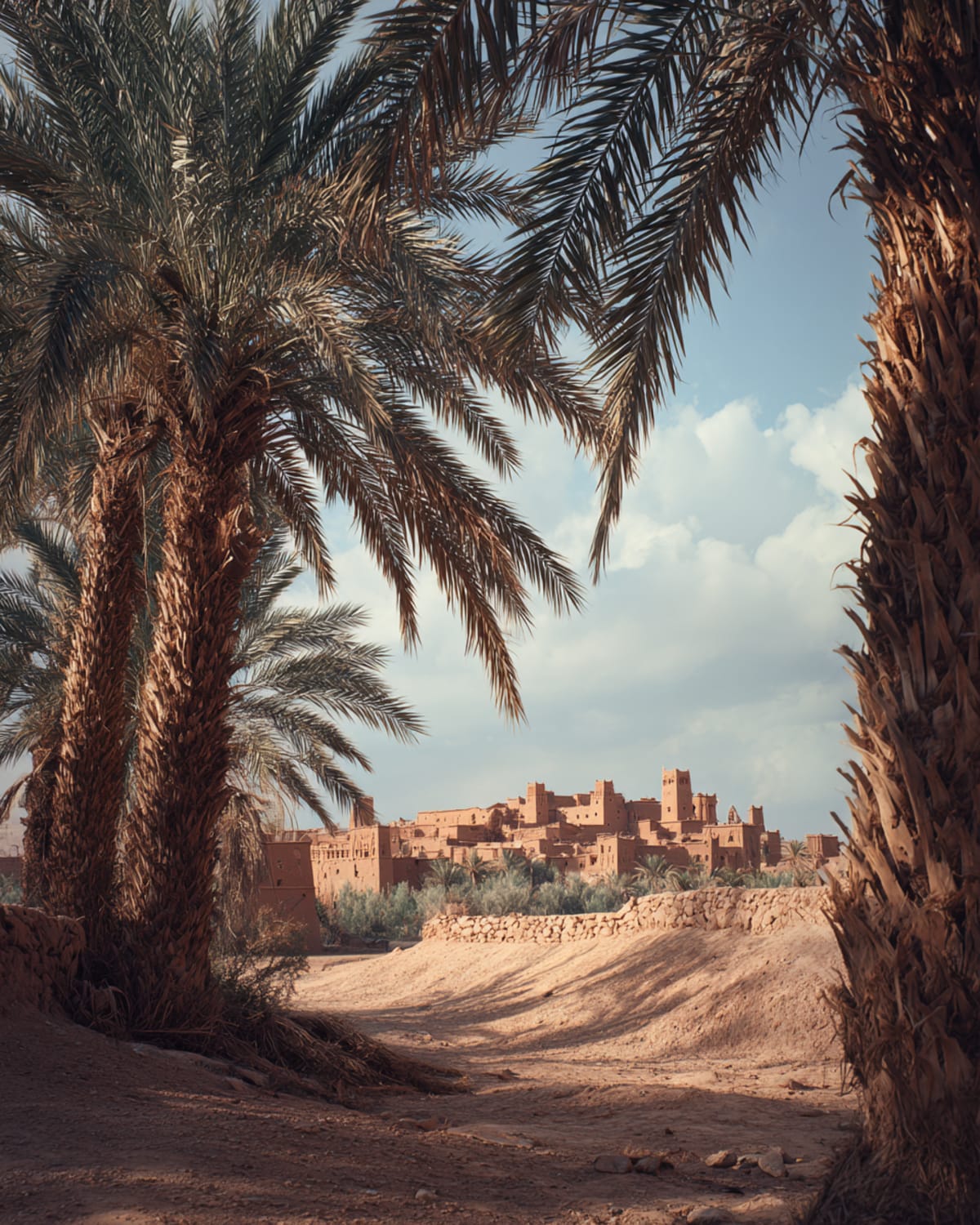 Over the Atlas at Tizi n'Tichka. The pass doesn't announce itself — you're just suddenly above everything, the air thin and cold, the road carved into the mountainside. Aït Benhaddou rises from red earth on the south side like it grew there, clay walls that have watched caravans for seven centuries. Then Ouarzazate, then the Draa. For two hundred kilometres the road follows Morocco's longest river — palm groves and kasbahs repeating like breathing, the green impossible against the rust. A roadside stop for dates, warm and amber, bought from a man whose hands are the same colour as the earth. Zagora marks where the road used to end. Beyond here, fifty-two days to Timbuktu. The sign still says so.