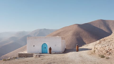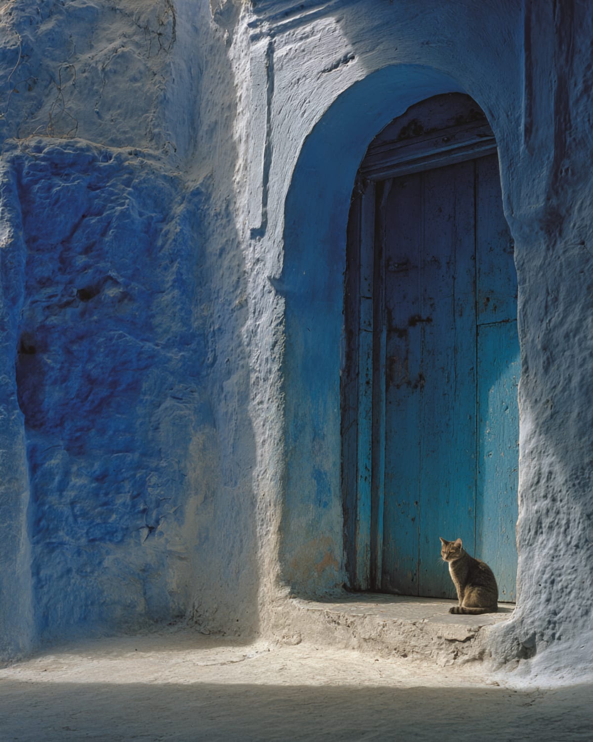 East into the Rif. The coast falls away — Asilah's white walls, the Atlantic light, the murals from the summer festival fading behind you. The road climbs through olive groves and cork oak, the air cooling and thickening with green. You smell rain before it arrives, then eucalyptus, then woodsmoke from a village you can't see. Chefchaouen appears in blue — not sky blue, deeper, the kind of blue that stays under your eyelids when you close them. The twin peaks of Jebel Chefchaouen hold the town like cupped hands. The paint started as refuge. Now it's just the way things are.