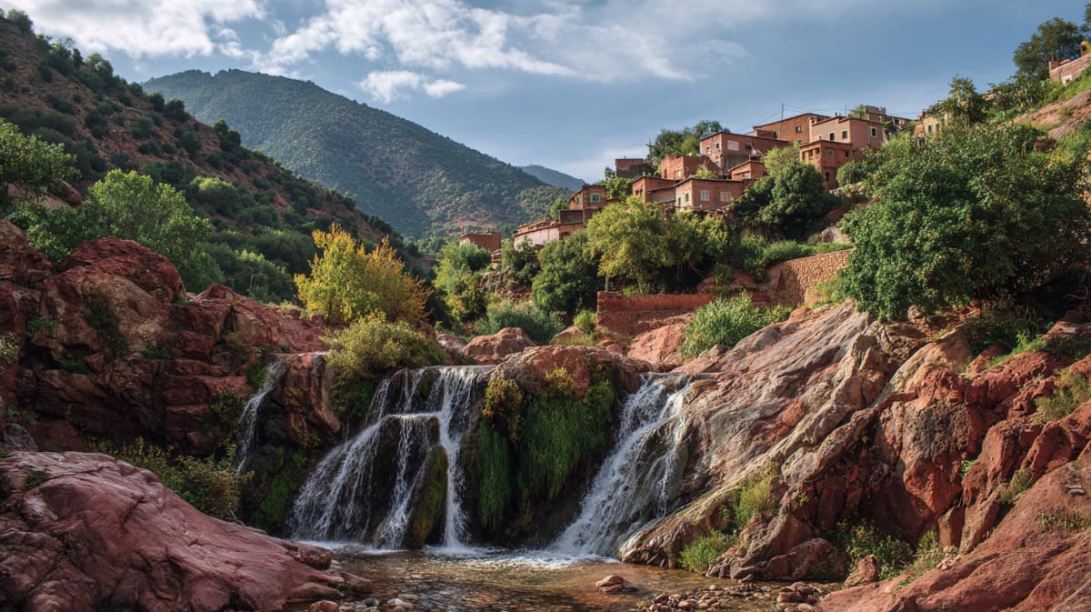 The road climbs south through the Haouz plain, red earth giving way to green as you enter the valley. The Ourika River runs year-round, fed by Atlas snowmelt, cutting through terraced gardens where Berber families grow mint and saffron. You stop at a village clinging to the hillside—stone houses, flat roofs for drying herbs, women washing wool in the river below. The air cools as you climb. A waterfall appears where the valley narrows, mist catching light. Lunch is tajine on a terrace overlooking the gorge, mint tea poured from height. By afternoon you're descending, the city emerging from haze, the call to prayer drifting up from a thousand minarets. Back in Marrakech for sunset. The mountains still visible, still pink, already somewhere you've been.