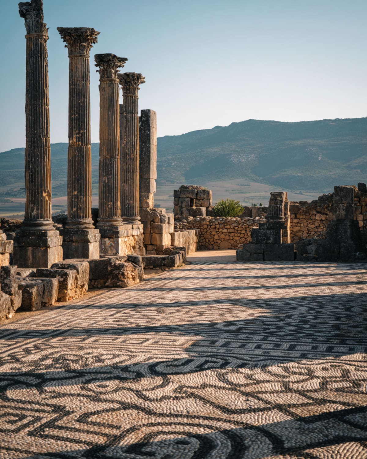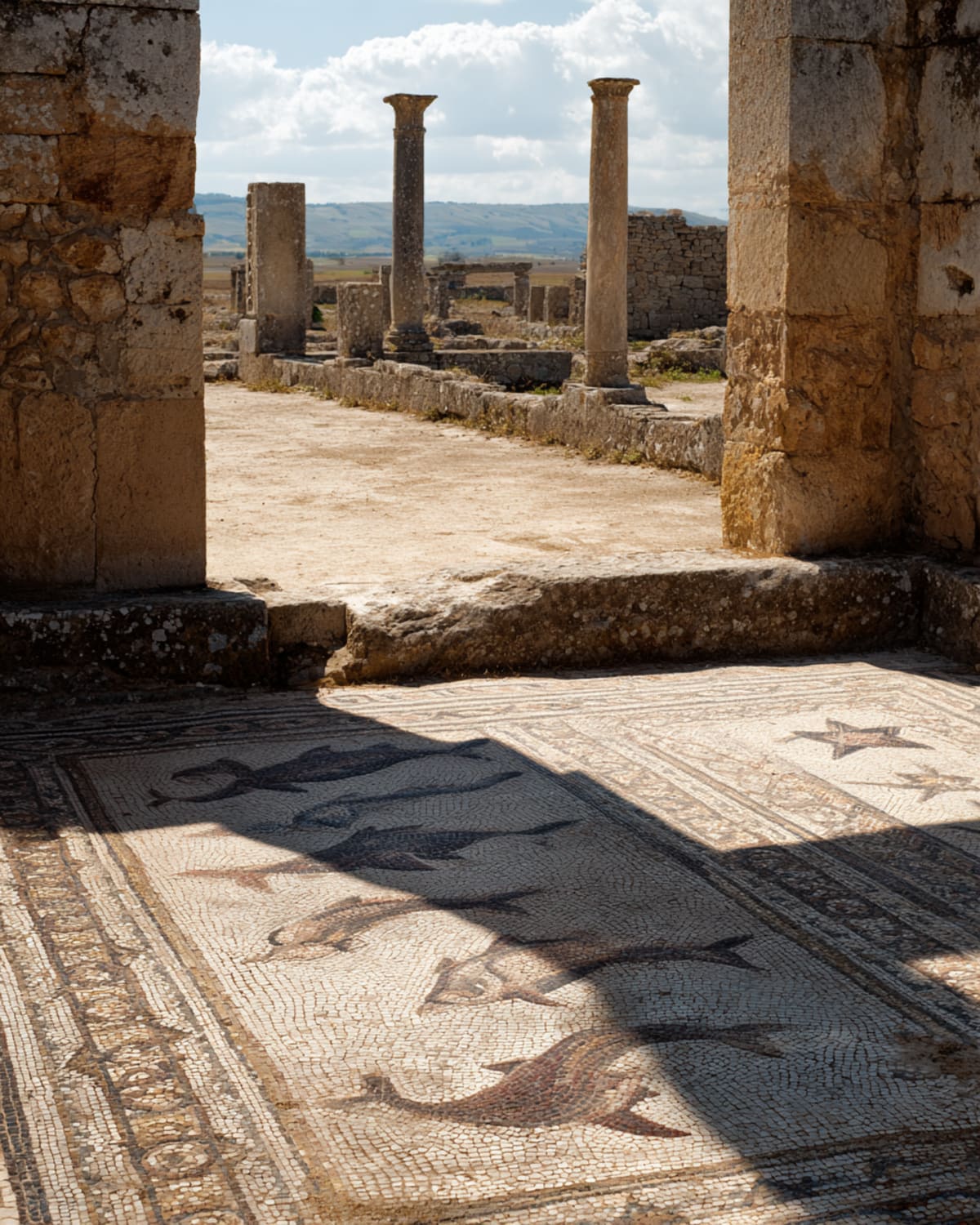 West through the Saïss. The road is short — barely an hour — but the detour changes everything. Volubilis rises from wheat fields like a dream Rome forgot to finish. Columns catch morning light. Mosaic floors lie open to the sky — Orpheus, Bacchus, acrobats and beasts, still vivid after two thousand years. Storks nest on the capitals. The silence is the kind that comes after something enormous has left. Then Meknes — Moulay Ismail's obsession, his answer to Versailles. Bab Mansour's tilework glints. The granaries stretch dark and cool. Two empires in one afternoon.