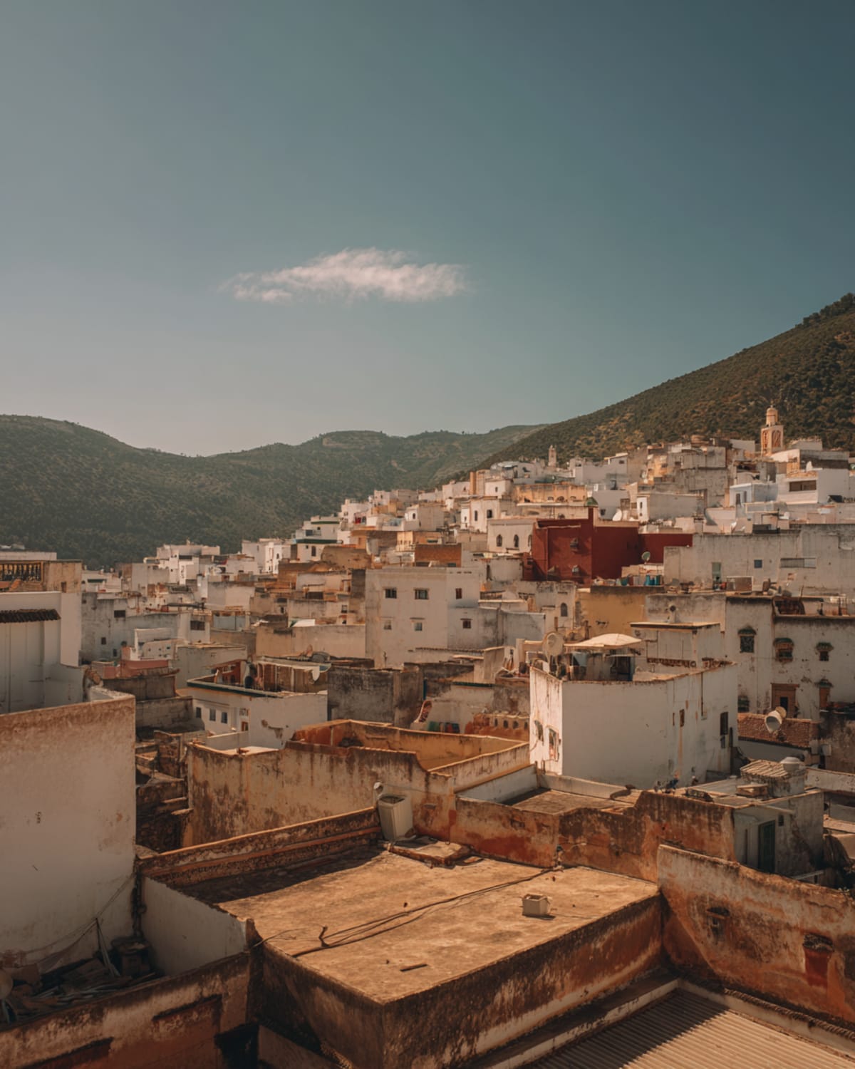 A short drive north through olive groves to the holiest town in Morocco. Moulay Idriss appears clinging to twin hills above the Zerhoun, white houses cascading down slopes so steep the streets become stairways. The man buried here founded Morocco's first dynasty. Pilgrims come year-round. The atmosphere is quieter than Fes, more watchful. The rooftop terraces look down over Volubilis in the valley below — Roman columns rising from wheat, two civilisations separated by a twenty-minute walk and fifteen centuries.