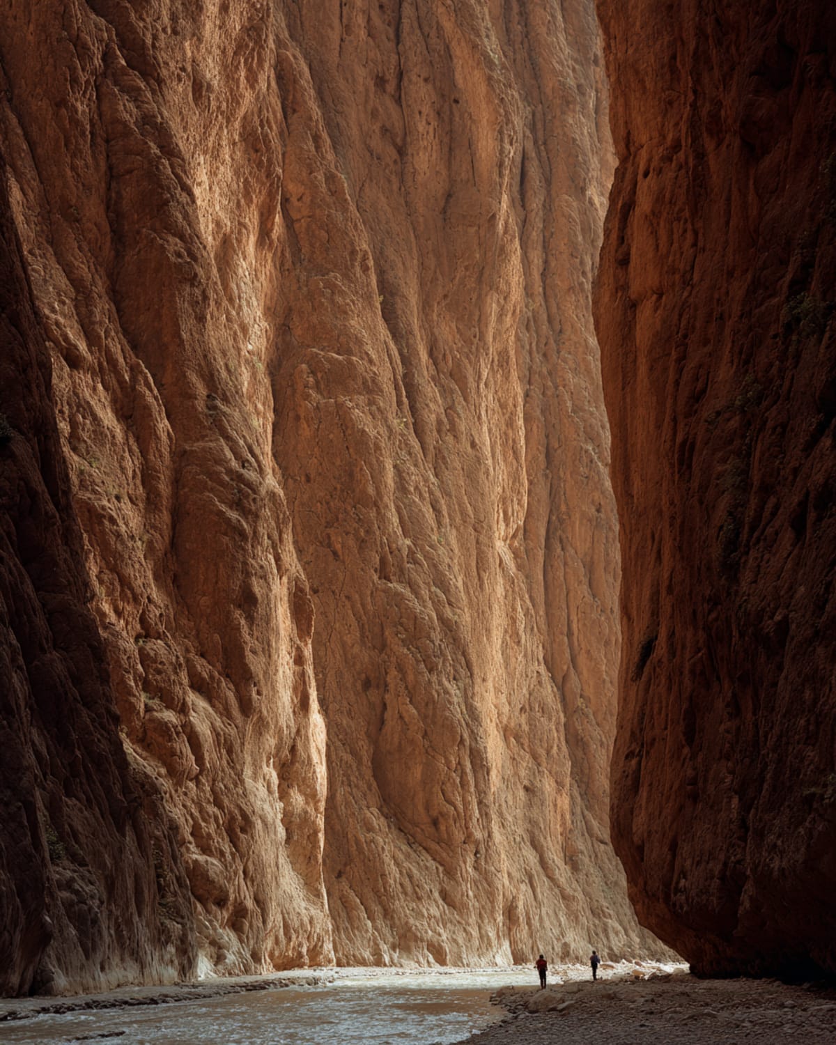 East into the pre-Sahara. The road stretches through country that empties as you go — each town smaller, each valley drier, the horizons widening. Tinghir's palm grove is the last serious green. Then Todra — canyon walls vertical and close, the afternoon shadow pooling at the bottom like spilled ink, the river running cold over your hand when you reach down. Beyond Erfoud the hammada ends. Erg Chebbi rises from the flat earth. The dunes turn gold, then orange, then colours your vocabulary can't reach as the light falls. Camp appears at the base. The sand is warm under your palm. The first stars arrive before you're ready.