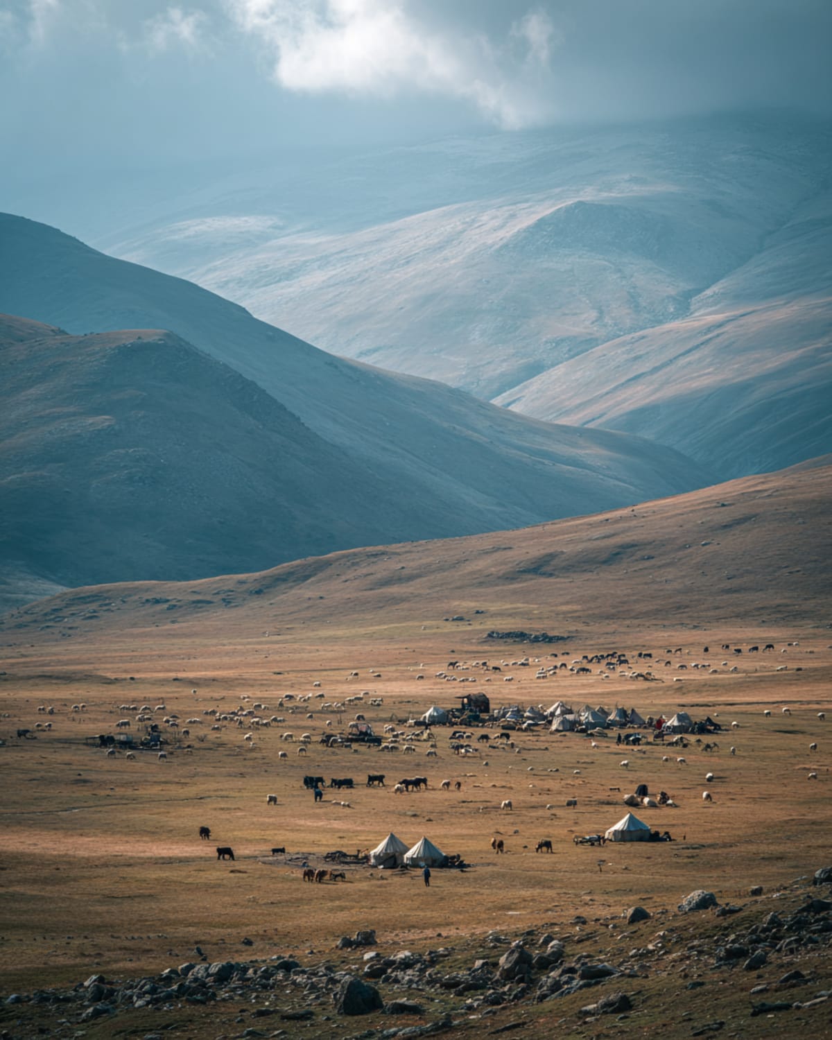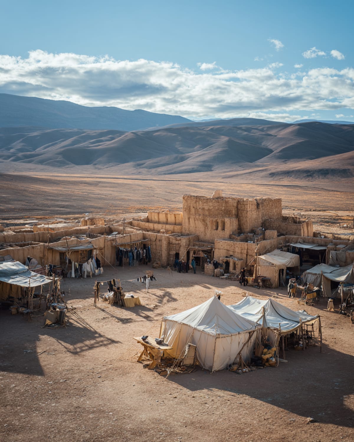 The road climbs out of the Happy Valley on switchbacks that tighten your grip on the armrest. Each pass reveals another valley, another shade of green turning to gold. The air thins until your breathing changes. Shepherds move flocks across slopes so steep the animals seem to float. Imilchil appears between its two lakes — Isli and Tislit, the lovers who wept themselves into water. The legend is everywhere here. The cold is real. The sky at this altitude is a blue so deep it almost hurts.