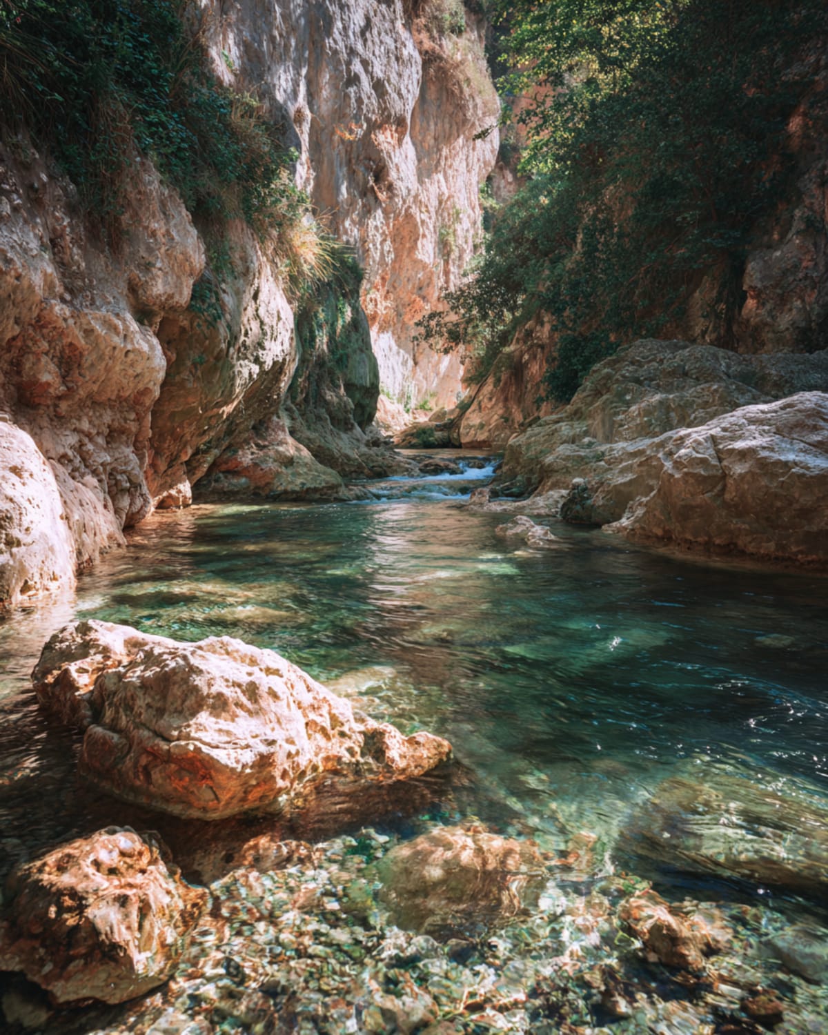 Into the Rif, where the road narrows and the green deepens until the forest swallows the sky. Talassemtane National Park rises around you — cedar and fir, the air thick with moisture and the smell of wet earth after rain that fell an hour ago. The temperature drops. Birdsong replaces traffic. Akchour appears where the waterfalls drop through rock into pools so clear you can count the stones on the bottom. The mist catches light and throws tiny rainbows. Your boots find the wet path. The mountains hold you closer here — not threatening, just present, like a hand on your shoulder.