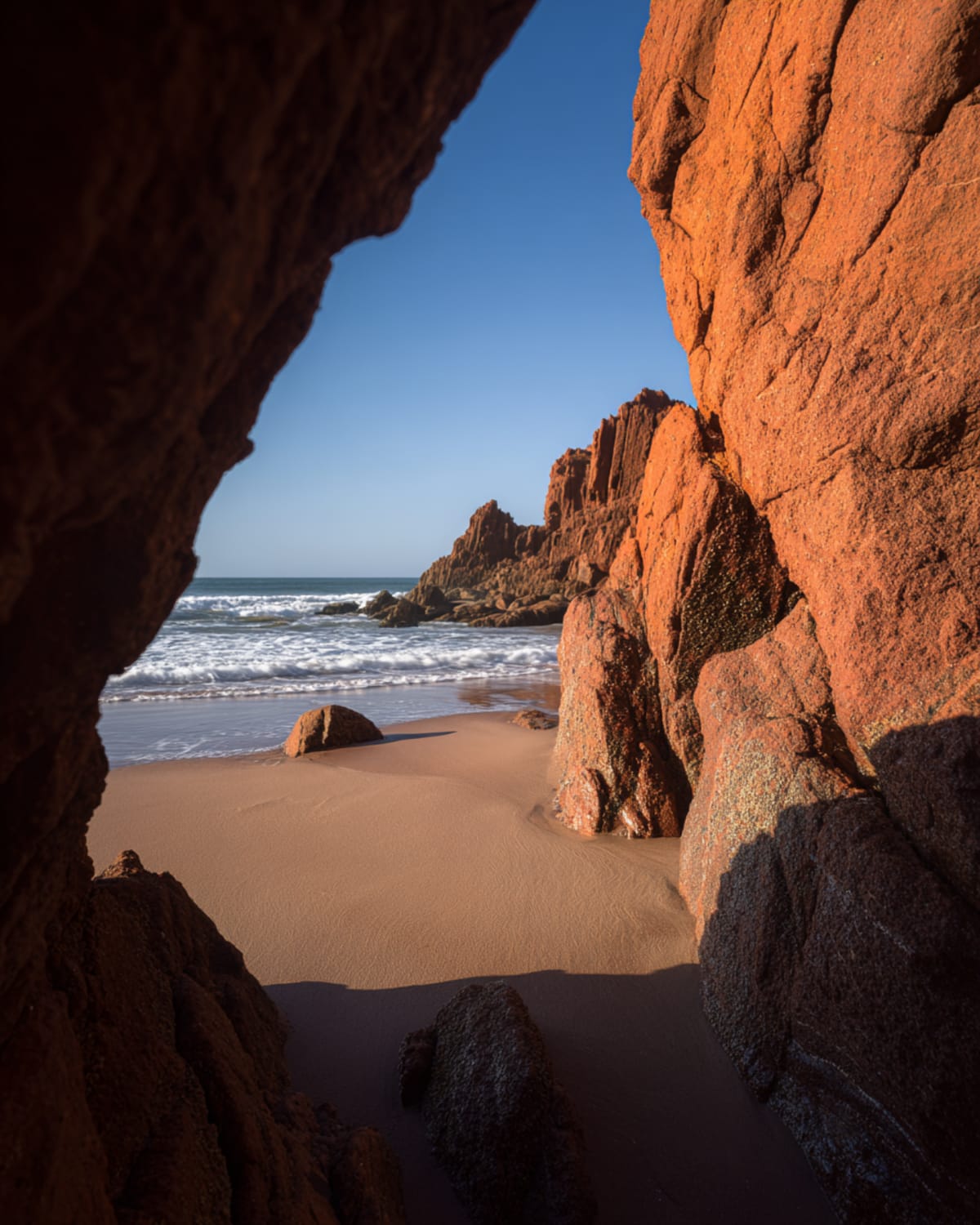 The coast road south from Agadir strips away everything familiar. Tiznit's silver walls flash past. The cliffs rise red and sharp, Atlantic swell crashing white against rock the colour of dried blood. Legzira announces itself with arches — sandstone sculpted by ten thousand years of salt water, standing in the surf like cathedral doors. The beach stretches empty in both directions. Your footprints are the only ones. The sand is warm and coarse under your feet, and the wind carries nothing but spray and the sound of a coastline that has never been tamed.