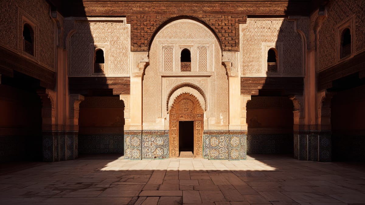 Start in the courtyard. Let your eyes adjust to the layering: zellige at ground level, carved stucco above, cedarwood at the top, sky overhead. Then explore the ground-floor galleries, the prayer hall, and climb to the upper floors to see the student cells.