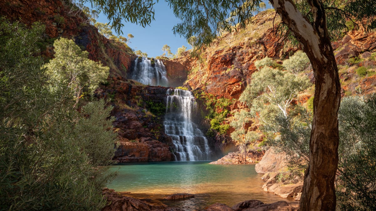 Three cascading tiers dropping into a plunge pool. The spray generates a permanent rainbow in the morning light. The canyon walls are red and green — rock and vegetation. Simple café terraces line the descent path.