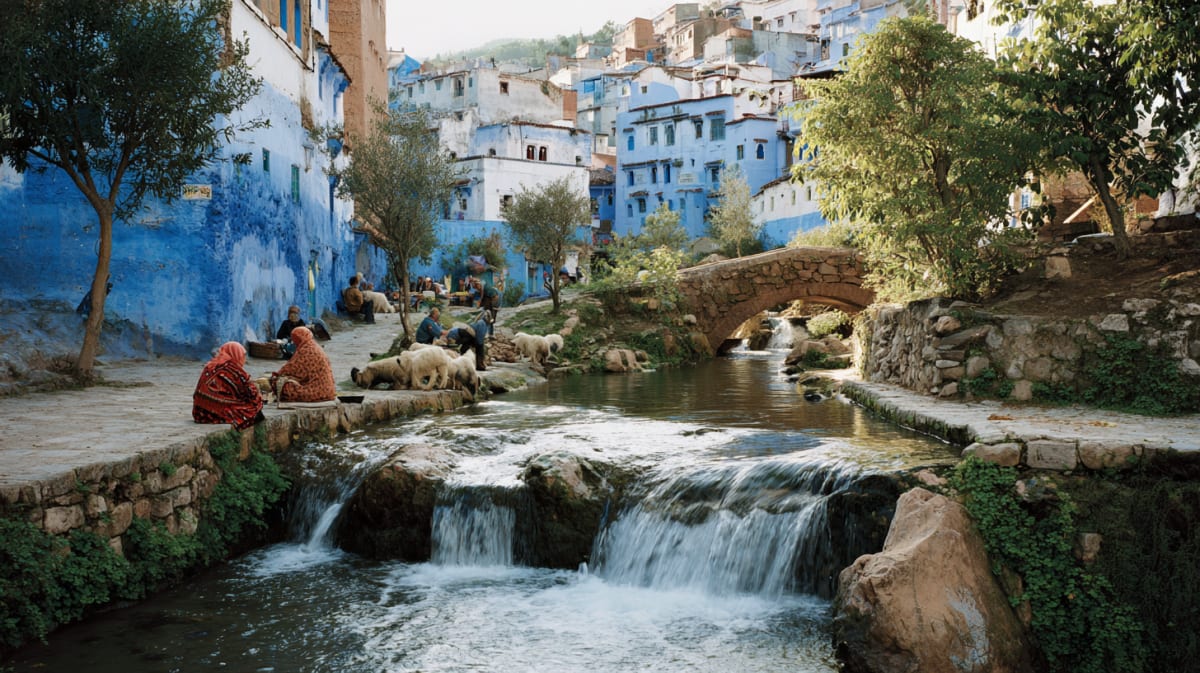Where the mountain spring emerges into town. Women wash laundry on rocks; children splash in pools. This is where Chefchaouen's painted blue meets actual blue — water and sky.